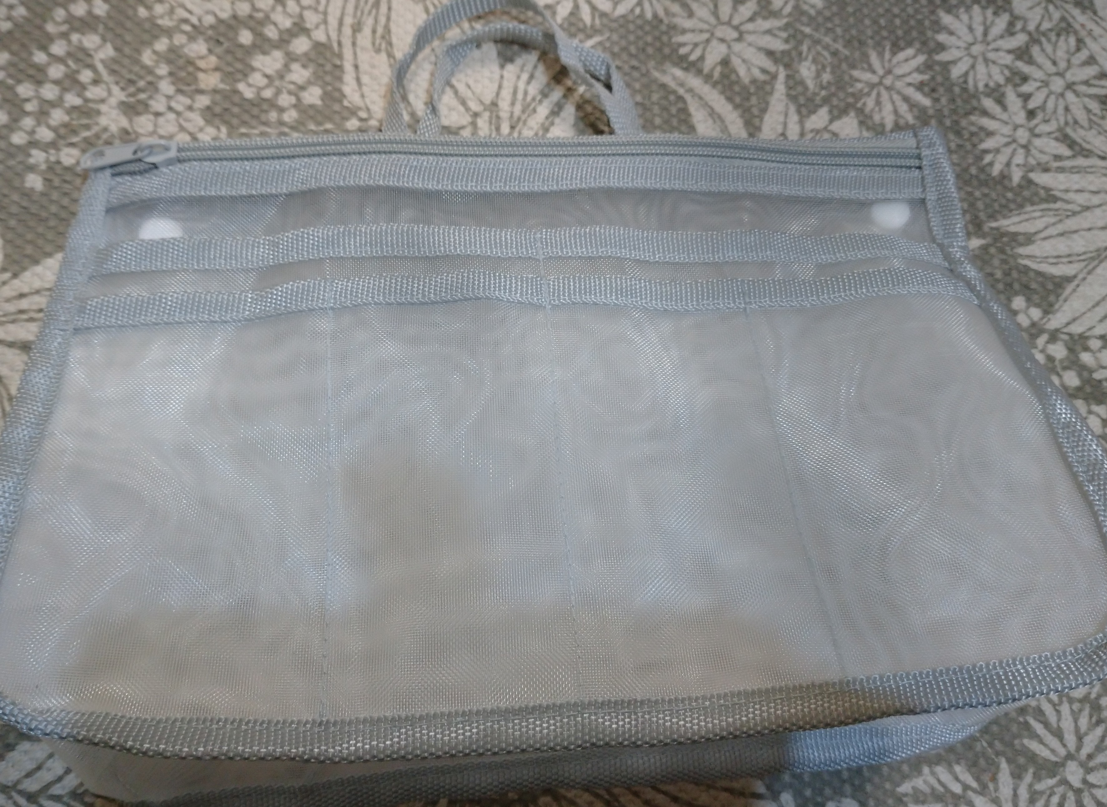 ↓番外編バッグインバッグ。これは、先週スーパー銭湯に行くときに、道具一式を忘れたことに気づき、ダイソーに立ち寄り購入した。