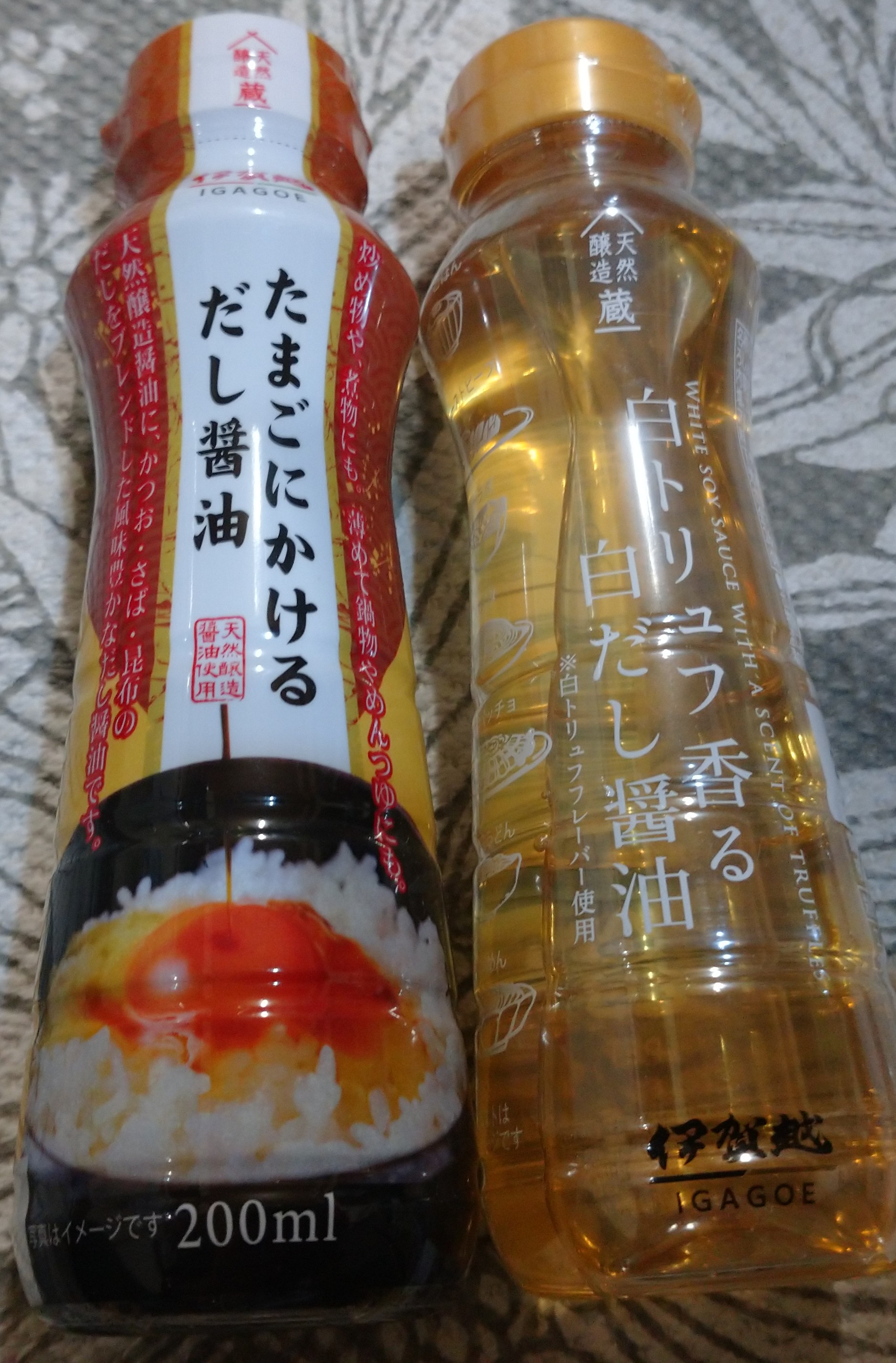 ↓伊賀越という創業140年余りの老舗の白醤油(左)。津軽びいどろの醤油差しを活かしたく、白醤油を買ってみたかったのだが、なんか敷居が高い気がして、ずっと断念していた108円ならその敷居はかろうじて超えることができる。卵にかけるだし醤油も、とても美味しそうに見えたため購入。