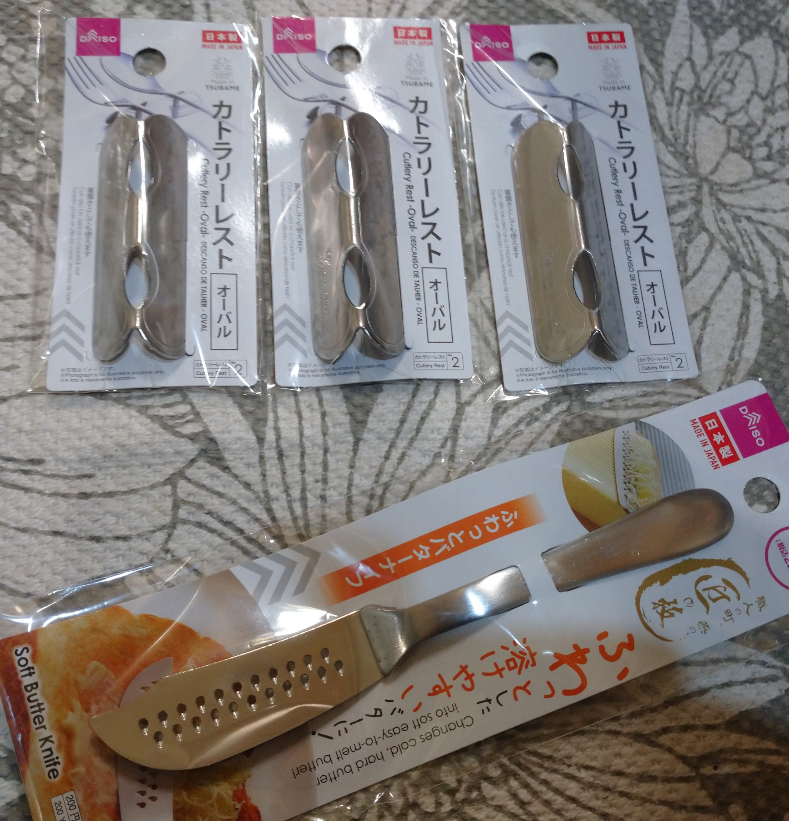 ↓燕三条のカトラリーレスト。と、バターナイフ。燕三条の刻印見るとテンション上がるよね。こんな本格的なものも取り扱っているダイソー。素晴らしいな!?スプーンやフォークも後日買い揃える予定である。
