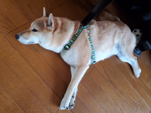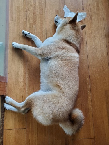 今日も真っ黒な雲が空を覆う中、頑張って散歩に行った。今日は黒のダックスフント君に会う、この子は柴犬が嫌いで、姿をみると吠えると言うのだが、コロには吠えずにトコトコと近づいてくる(出会ったのは1年以上前から)コロは一定以上近づくと逃げるし用心しているが、それでも逃げ始める距離が縮んできている。今日はお互いそこそこ近くで、地面の匂いを嗅ぎながら、しばらく一緒に散歩していた。家に帰るとするべきことがあるので、あまり休憩はいれずに頑張って掃除と洗濯をすます。一通りしたところで休憩して、昼食をはさみながら手洗いをするべき衣類を手洗いする・町内会のイベントの広報紙(来月号)下書きを作成する明日の町内会のイベントの費用について準備する二階の片付けを掃除をすませるということでするべきことは終了した。まだまだしないといけないことはあるが、当面気になったことはクリアできた。コロが寝ていると。右前脚を空中に浮かしたまま寝ている(上の写真)こういう寝方でしんどくないのか心配になる(笑)結局昼過ぎには雨が降りだしたので、外には出られなかったが4時には雨が上がった。無事夕方の散歩もできてよかった。