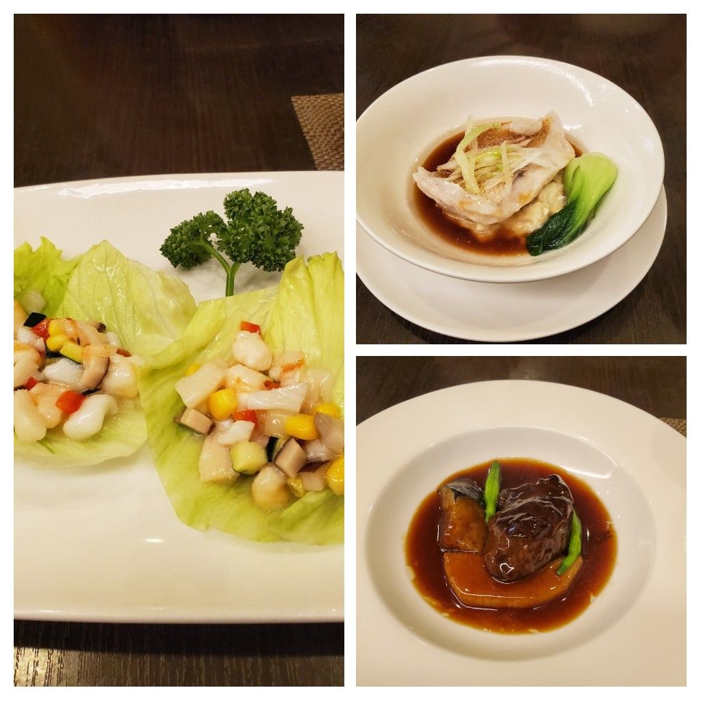 海鮮と野菜の炒め物のレタス巻き 金目鯛と豆腐の蒸しもの 黒毛和牛中華風ソース煮