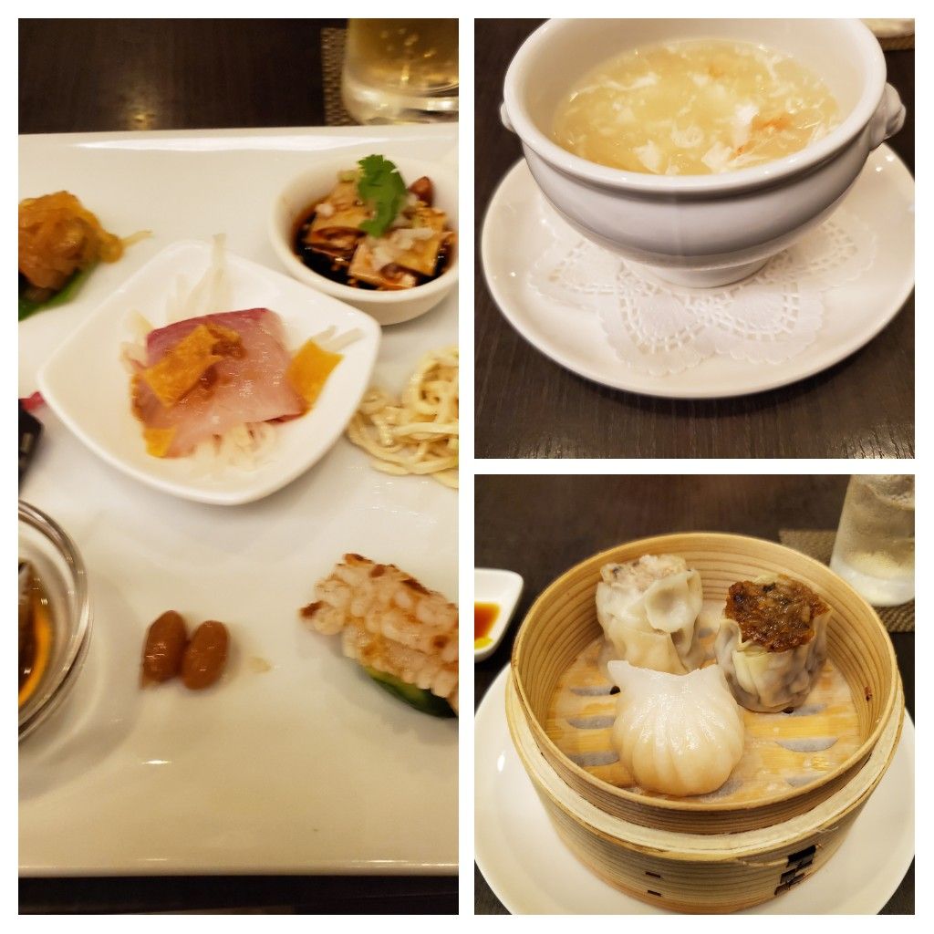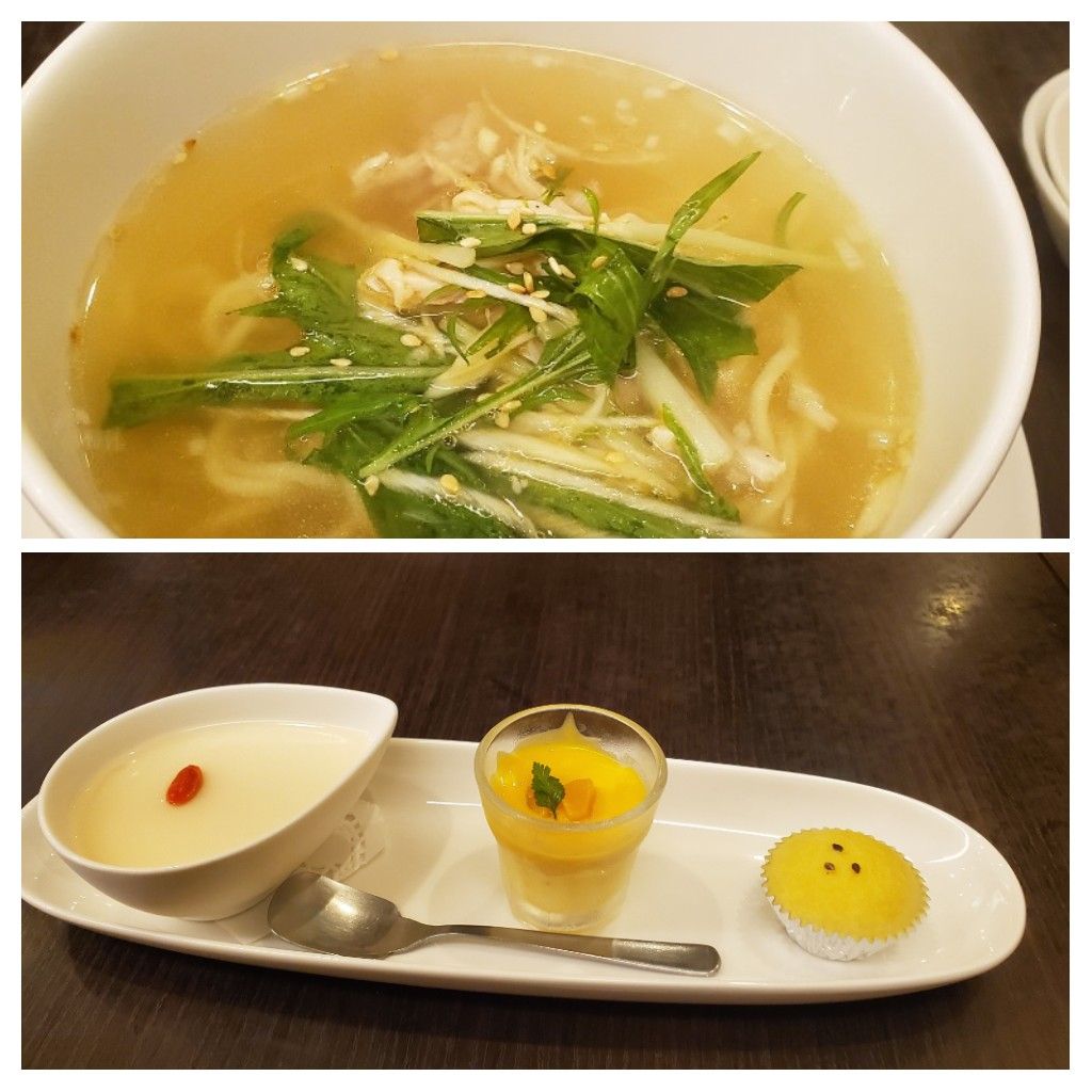 オードブル、冬瓜と蟹入りふかひれスープ、三色点心