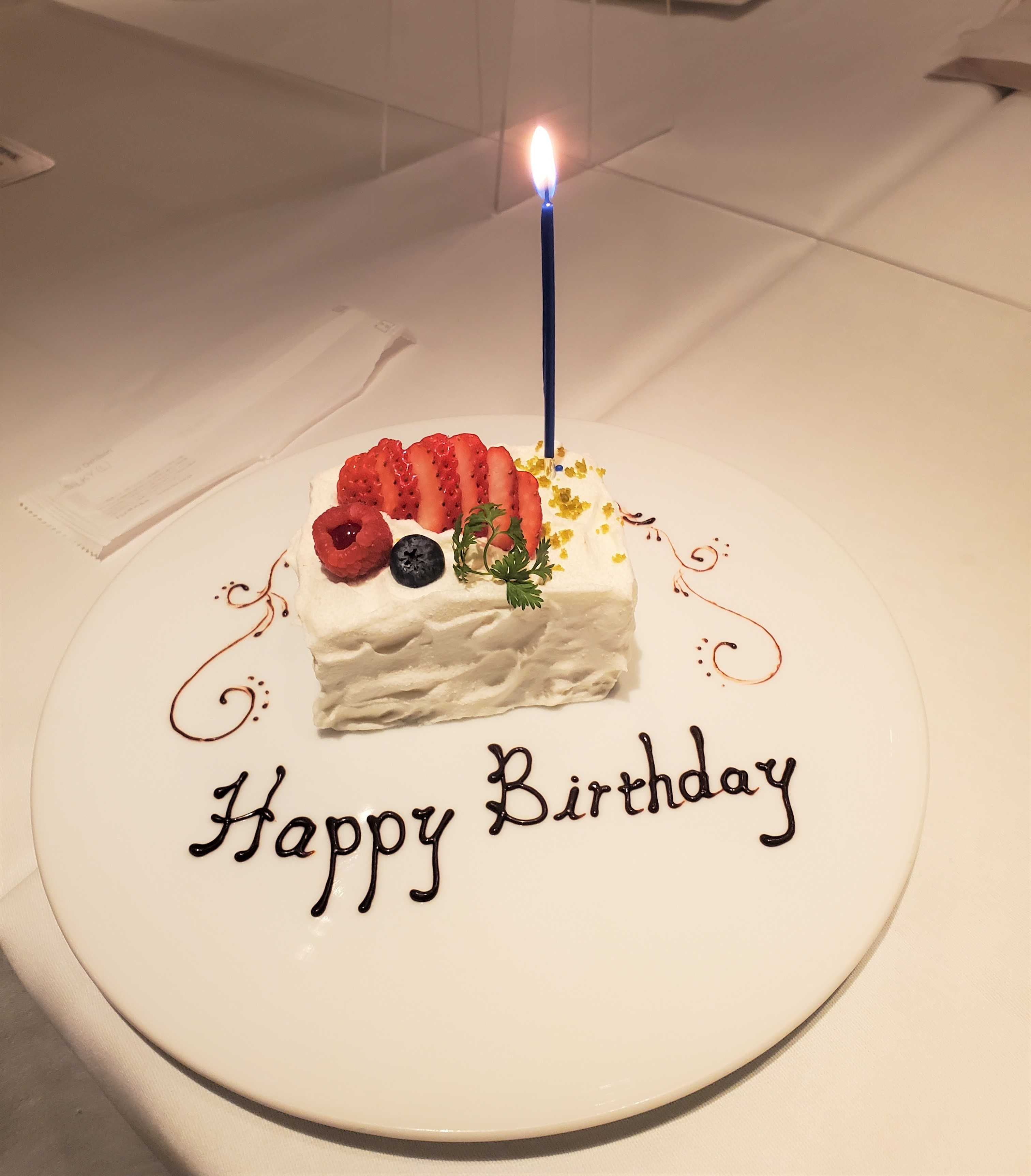 私の誕生月の優待ということできているので、サービスでケーキと写真がつき、飲み物とコース料理すべて3割引きだった。