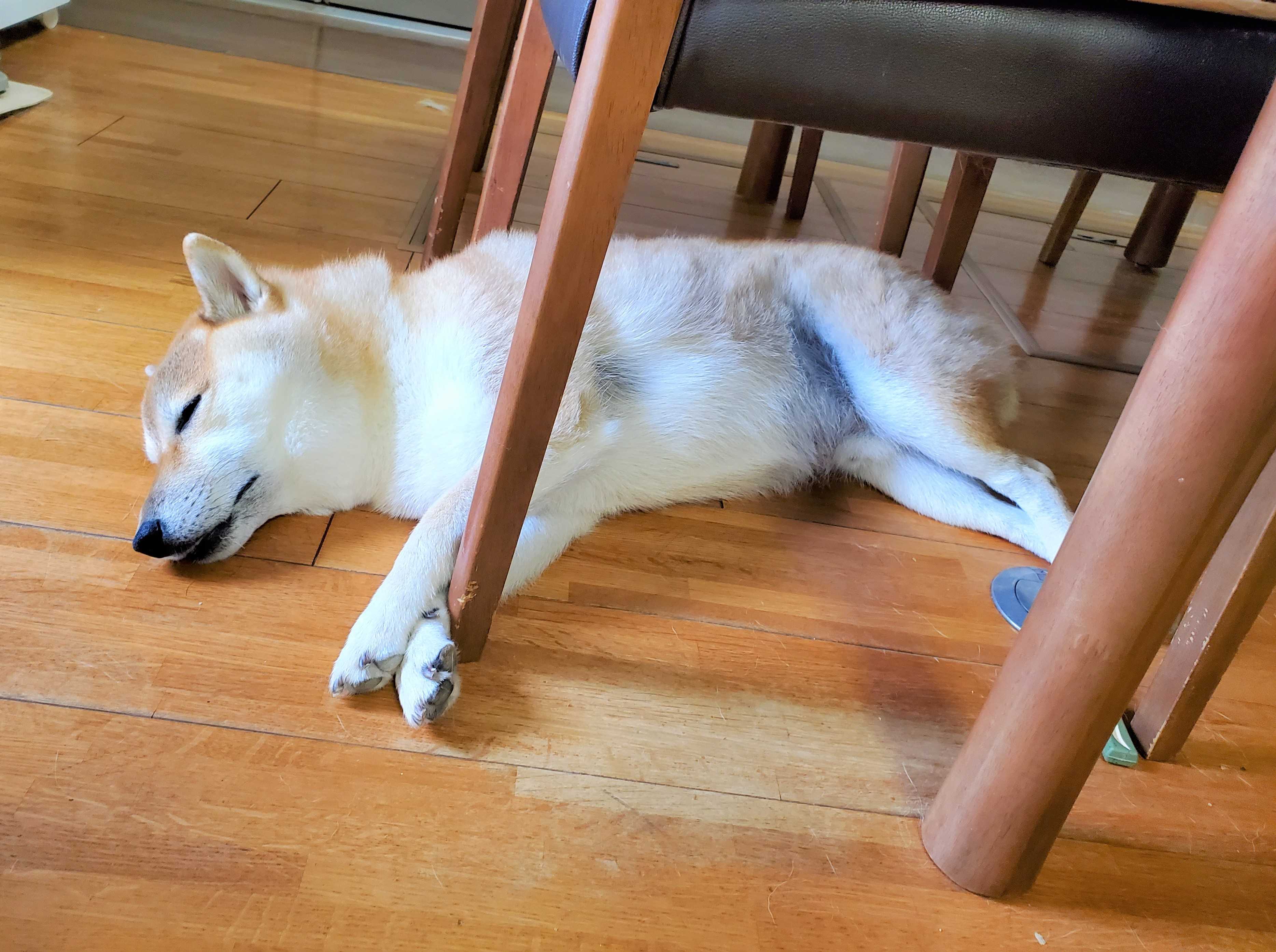 今頃がちょうど涼しいし気持ちがいいと思うが、コロにはまだ少し暑いようだ。