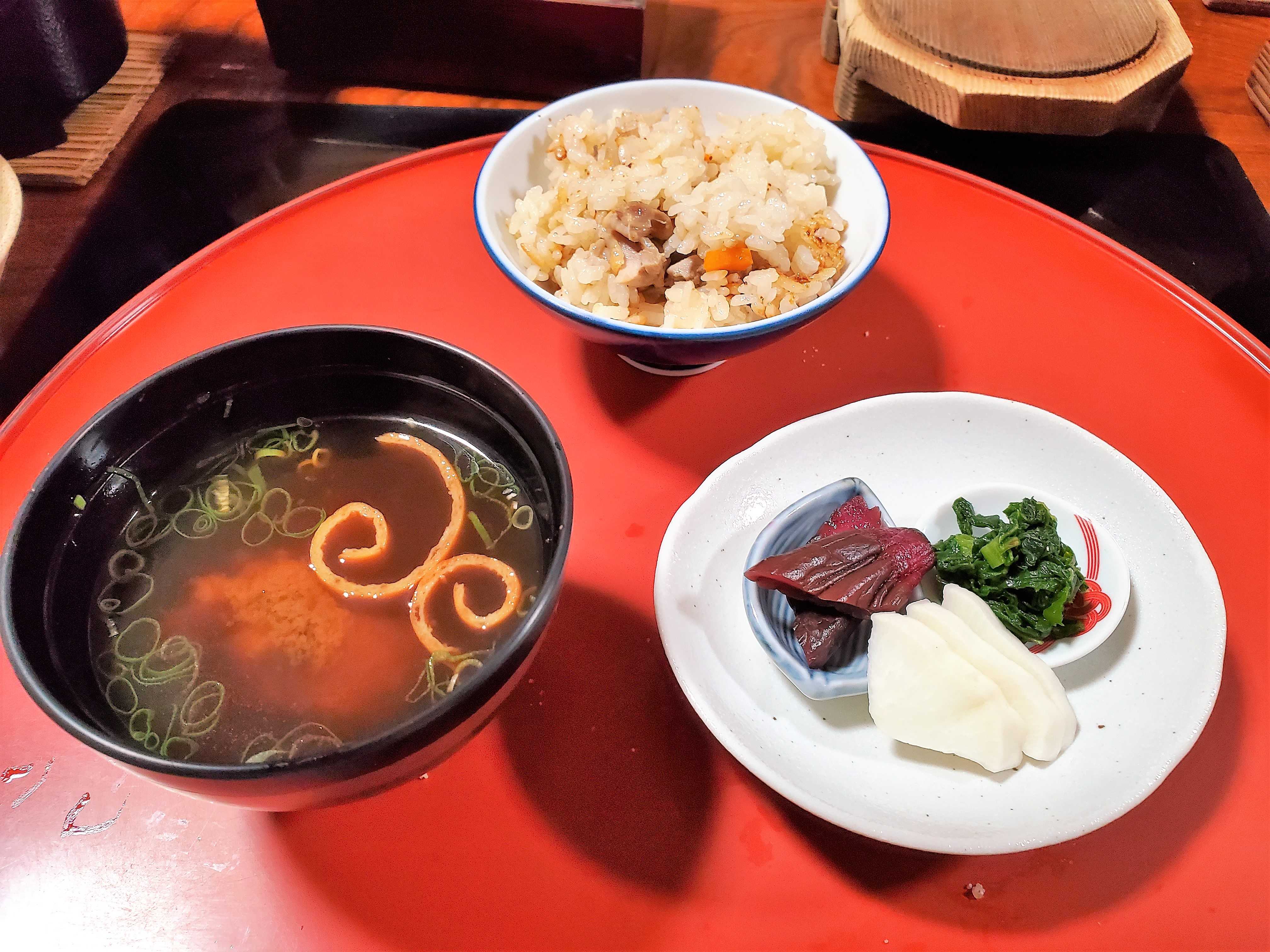 地鶏釜めし(鳥の味がしっかりしていた) お漬物は女将の手製(86歳)