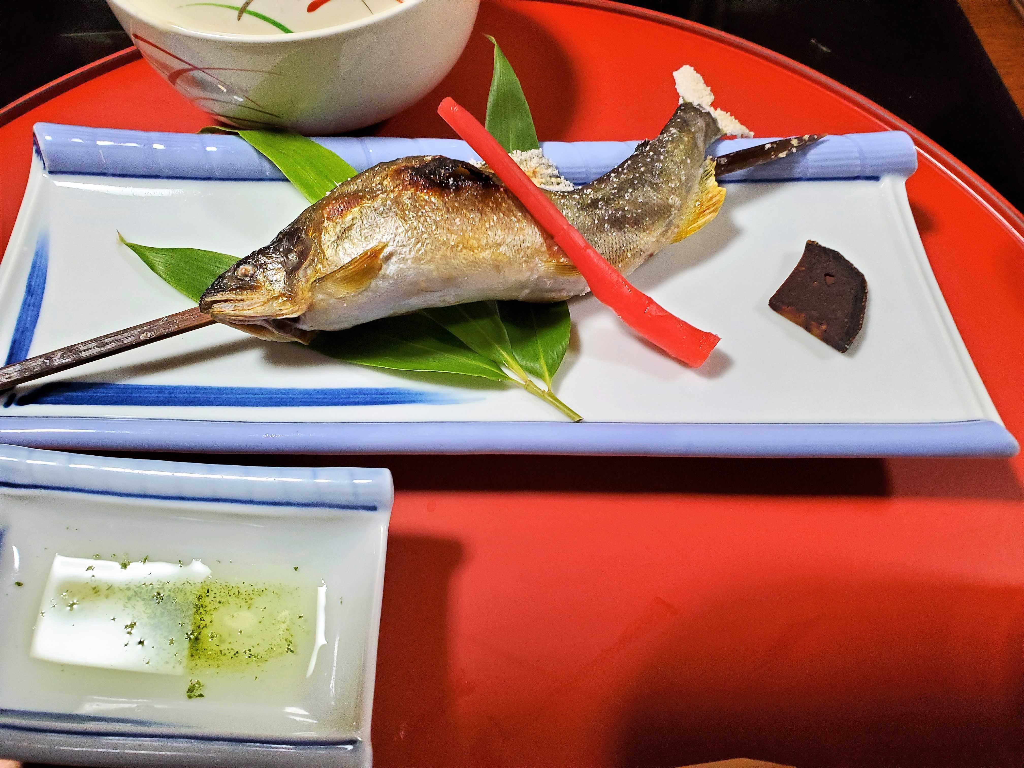 子もちアユの塩焼き(おなかの中には卵がいっぱいで、11月しかこのアユは食べられないということだった。おいしかった)