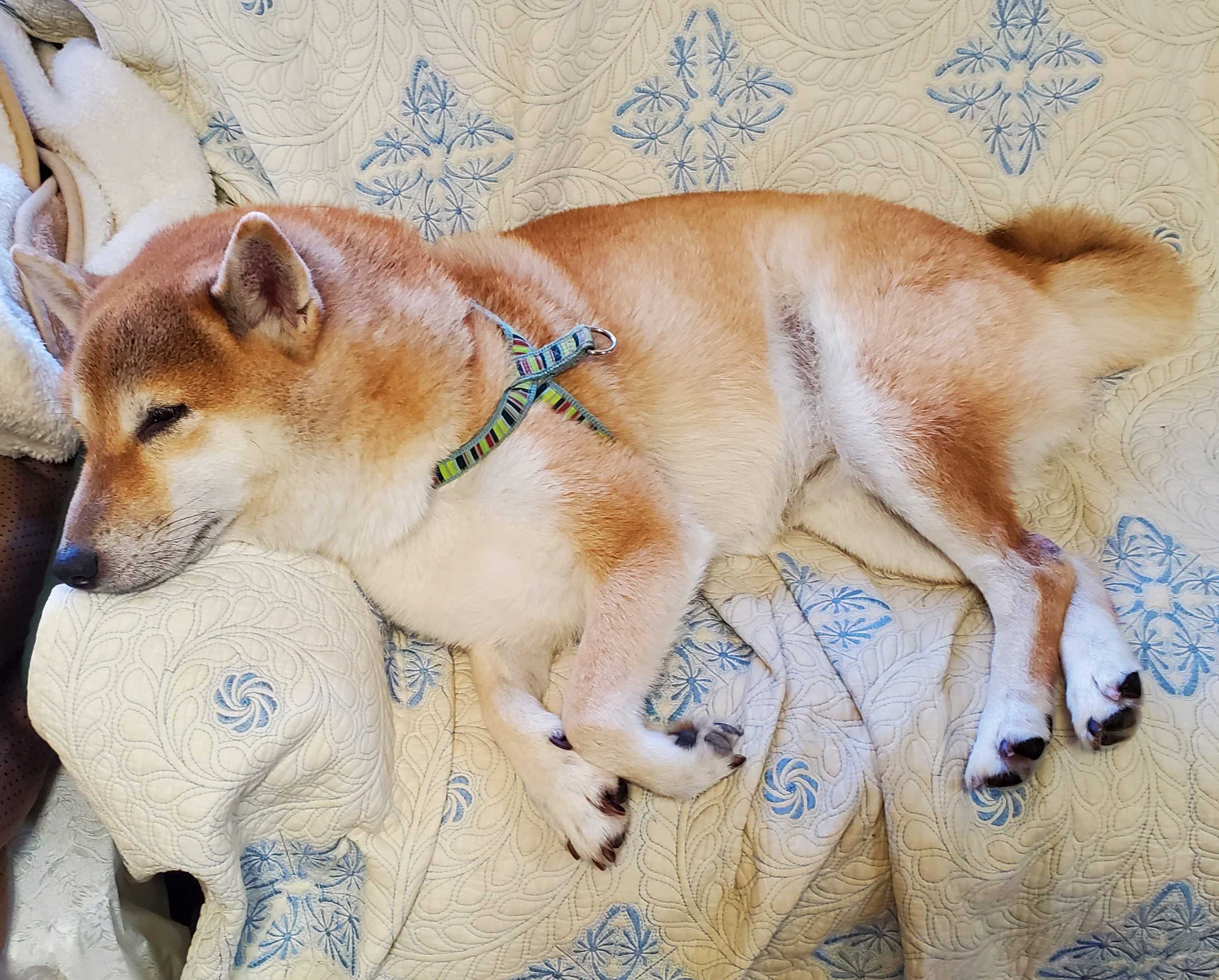 今日はちょうどいい気温だったので、昼寝も気持ちよくできました。お母さんが帰ってきたときに、おねだりしておやつを少しもらいました。ラッキーbyコロ