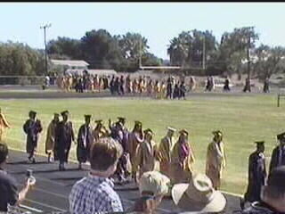 先週、出張から戻って次の日は、娘の高校卒業式。当たり前のように見事に晴れ渡った、高校のフットボール場で開かれました。娘に、「日陰になる側の席(正確には、太陽を背にする側に)に座った方がいいよ。」と、言われていたものの、開会1時間前で既にそちら側は満席。止むを得ず太陽に向かって座る側に。さすがに、後でかなり日焼けしました。(ちなみに、当の娘は、式の後、真っ赤なお鼻でした。)午後4時。いよいよ入場。フットボール場の端から入ってきた卒業生達は、「観客」(って呼ぶ方がいい感じの来客)たちの鳴り物入りの声援に、手を振って答えながら、トラックを1周して、最後はフィールドのゴール側から卒業生席まで行進。男の子は紺色の、女の子は金色の、ガウンに角帽スタイル。それぞれに、首から(ある成績以上の子がもらえる)メダルを掛けたり、レイを掛けたりと様々。ゴスペラーズみたいな、学生のコーラス隊による国歌。引き続き、彼らのコーラスにより、「In my life」メインボーカルの女の子の響き渡る歌声に聞き惚れました。(残念ながら、こちらの客席からは、コーラス隊の姿は見えませんでしたが。)学生会プレジデントを筆頭に、学生代表たちによるスピーチ。自分達の達成を褒め称え、将来への決意を力強く語る。生徒からも家族たちからも大声援!卒業証書授与。といっても、実は、ここでもらえたのは入れ物だけだったらしい。この夜のディズニーランド徹夜ツアーか、それに行かない人も、それぞれの打上げパーティを、事なく終えた生徒だけが、次の日に中身を受け取れた。(ま、皆もらえたんでしょ。きっと... (^^;)卒業生500人。最後の生徒が受け取った後。全員立ち上がって、それぞれが証書入れと共に受取ったヒマワリを高く掲げて祝福。 いよいよ式が終わる瞬間。皆が、一斉に(?)角帽を投げ上げる。(ビデオから起こしたので、よく見えませんが。)娘の話だと、いつ投げていいかちょっと戸惑っていたという。確かに、ちょっとばらばらだったけど…。ま、オッケー!みんな、卒業おめでとう!!!