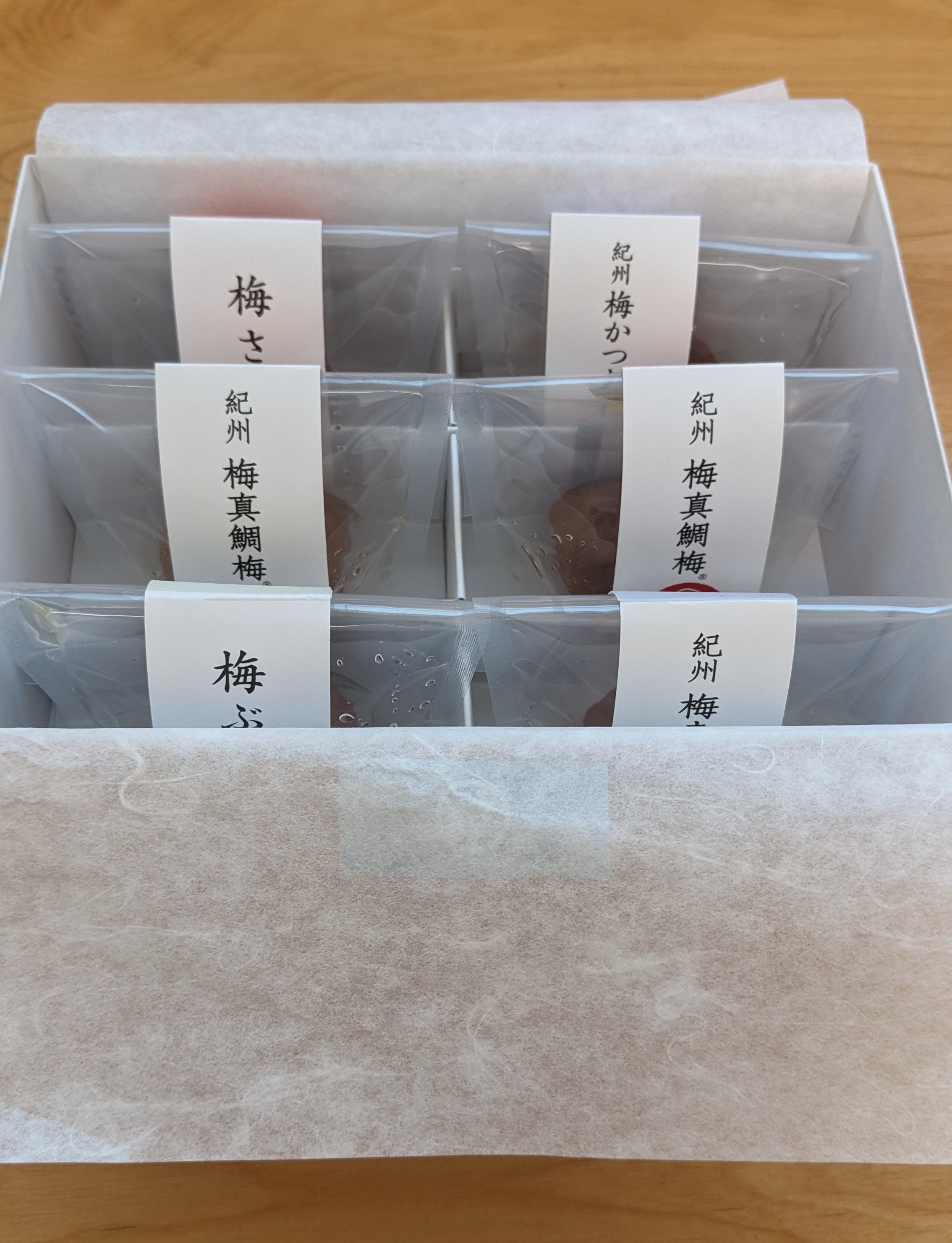 皆さんはバレンタインデーはいかがお過ごしでしたか?私は夫からチョコレートよりも、何かしょっぱいものが欲しいと言われまして、色々探しました。そして発見したのが『梅真鯛梅 五種詰合せ』(6個入り)です!南高梅の中に、鯛など魚のほぐし身が入っているオシャレで珍しい逸品です。鯛は2個入り、ぶり・さけ・まぐろ・かつおが各1個入りです。今回は鯛をお茶漬けにしていただきました!半分に割ると、中には鯛のほぐし身がしっかり詰まっています。梅の甘酸っぱさと鯛のしょっぱさがいい感じで合わさります。そのまま食べても、お茶漬けにしてもおいしいのは嬉しいですね。「直射日光、高温多湿をさけて保存」とあるので、常温保存可能な商品です。贈り物や手土産としても喜ばれそうですね!