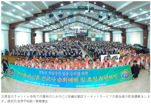 家庭連合が全国の礼拝ツアー「世界平和と神統一韓国の未来世代のリーダーになる」世界平和統一家庭連合(統一教会)は、神様を中心とした世界平和と神統一韓国を創建するために9日、銅大教会で「天苑宮天一聖殿入宮勝利のための仁川京畿北部教区巡回礼拝」を仁川京畿北部圏牧会者および青年信徒など1000人余りが参加したと発表した。この日の行事は、韓鶴子総裁の孫である文信出・文信興宣教師が米国、ヨーロッパなどで直接経験した宣教活動の証を通じて、天の父母様がされる人類救援と平和活動を韓国牧会者と青年信徒たちに伝える特別な時間として設けられた。文信出宣教師はヨーロッパで宣教活動を通じて「宣教師活動に対する本質的な目的と理由を自ら悩みながら私たち全体のための活動になるよう努力した」とし「真のお母様の御言葉を深く悟るきっかけになり、天の父母様は私たち全員を子供のように愛しているという御言葉を必ず伝えたい」と話した。米国で宣教活動を繰り広げた文信興宣教師は「伝道、信仰共同体活性化、礼拝変化、信徒プログラム運営、青年信徒ケアなど5つの目標を置いて活動に取り組んだ」とし「多くの困難と挑戦があるたびに真のお母様の御言葉を振り返って心を掴んでいた。皇甫國韓国協会天苑宮入宮時代は天の父母様の本性に最も似ている祝福家庭の子女である「ピュアウォーター」に先に訪ねてくるだろう」とし「真のお母様は祝福の子供たちが全世界に進み、世界を浄化して未来を輝かせる中心人物になることを願う。続いて「真の家庭3大圏である文信出・文信興宣教師の家庭を中心に、全世界の「ピュアウォーター」の子どもたちが未来世代の指導者として成長できるように真心を集めよう」と要請した。この日の礼拝は、オ・インチョル仁川京畿北部教区長の司会で、銅青年賛美団の開会賛美、礼拝、家庭盟誓、感謝祈祷、聖歌隊賛美、文信出・文信興宣教師の宣教活動証、黄保国朝鮮協会長の言葉、「帝王蝶」、巡礼会になった後、 400人余りが参加した「青年心情分け」の時間もあった。巡回礼拝は今月中、釜山蔚山教区、慶南教区、ソウル北部教区でも開かれ、ソウル清坡洞原本副教会、釜山沙羅ゴル聖地、天安ユグァンスン熱史遺跡、慶州仏国寺など家庭連合主要聖地と国内代表遺跡地巡礼日程とともに進行される。一休さんのような機知(トンチ)ではありません。奇知=人とは異なる知恵すなわち神様の知恵世界平和を願う奇知の外の凡人が徒然なるがままに書く日記です。↓↓ にほんブログ村ランキング参加中。応援クリックお願いします。↓↓