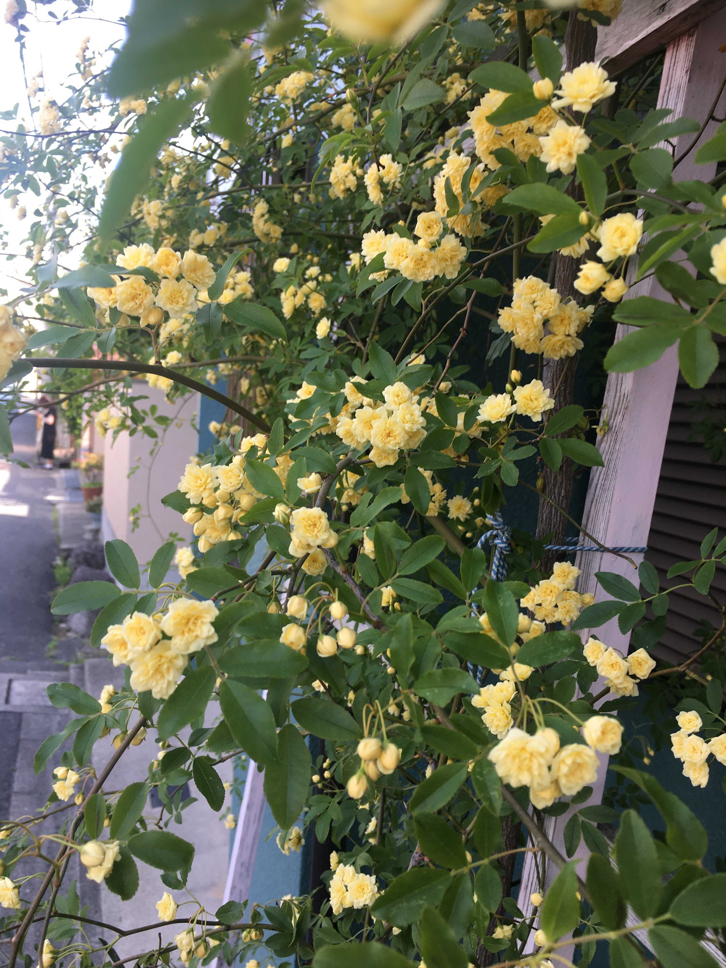 春っぽい。もっこうばらが花盛りです。こちらは昨日の日記のミョウガ。数本、芽が出てます🌱