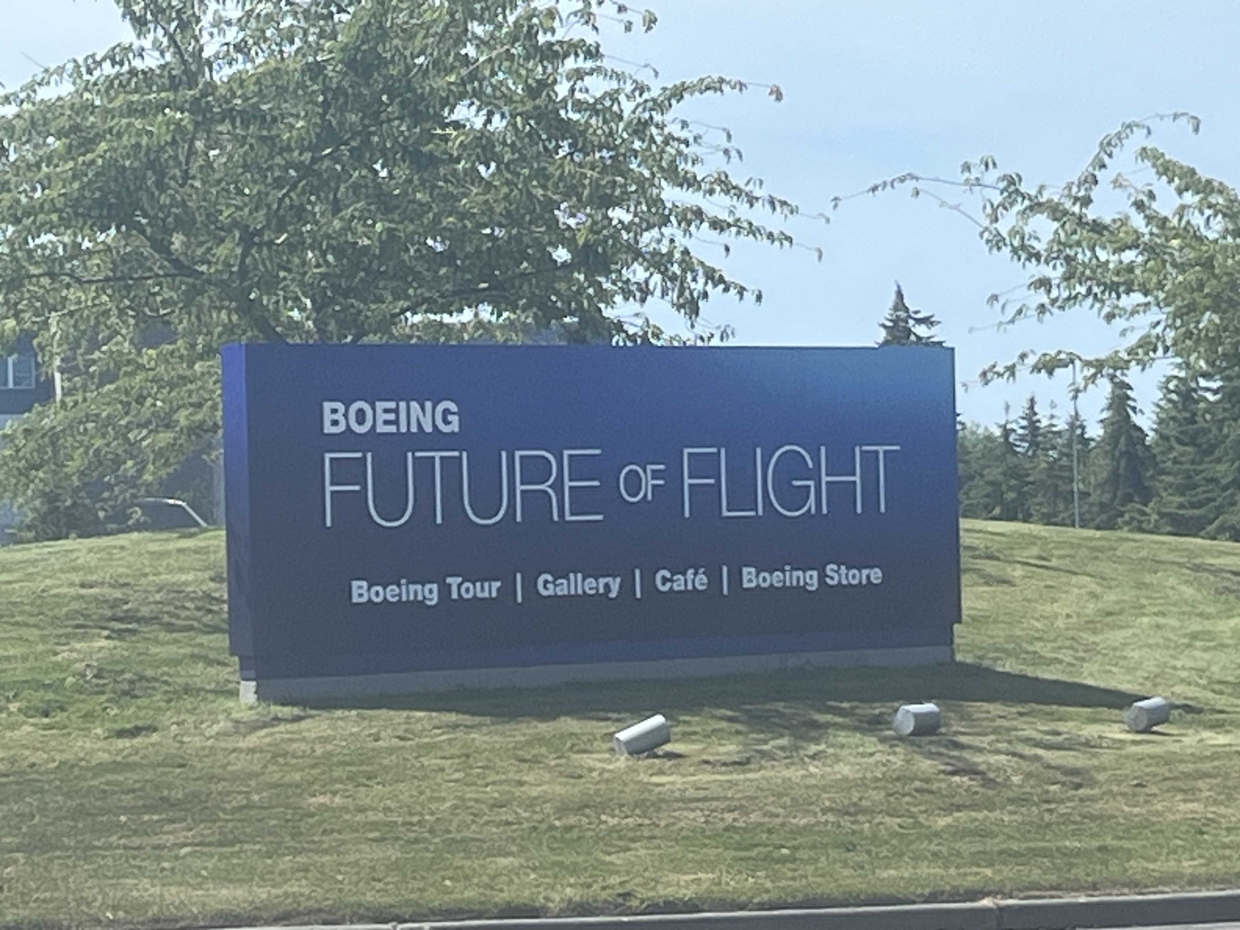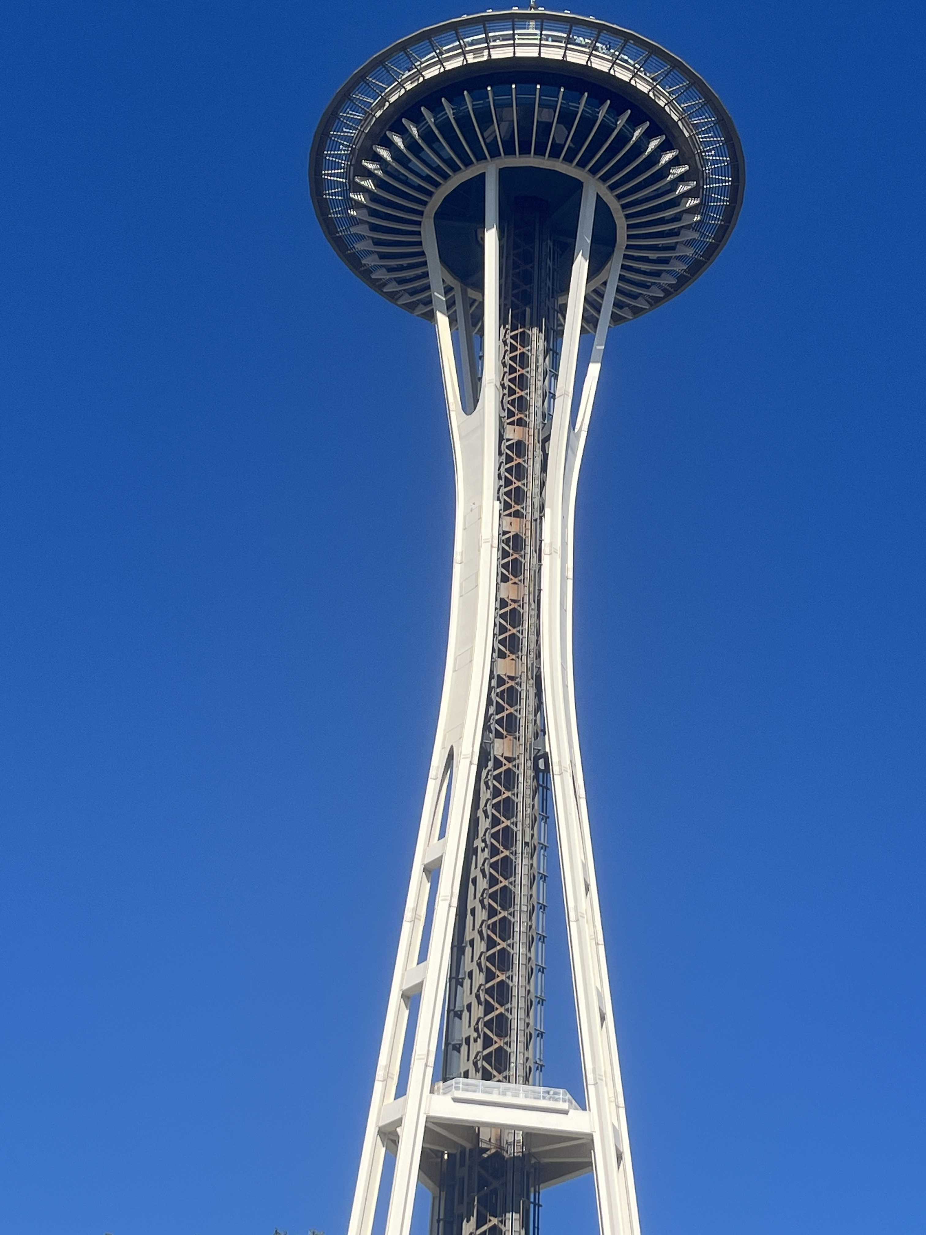 四日目はボーイングに行きました。飛行機の工場ですが、ハンカチ一枚持って入れません。受付前に透明ロッカーがあって、全部そのないにいれてバスに乗って移動します。工場内は飛行機が数台あり、整備士たちが整備中です。気にした事無かったけど、貨物用は座席もなく、窓もなくただの筒状態。思った以上に外側の壁も薄いし、知らない事いっぱいでした。輪切りで並ぶ飛行機の姿は珍しいものでした。飛行機のお尻の羽の現物。小さく写っている人と比べると、驚きの大きさ💦飛行機ってやっぱりデカい💦ボーイングはスペースシャトルも作っているので展示がありました。スペースシャトルって意外と広い。こんな場所で人間がふわふわしているのねーって思いながら見学しました。ホテルに帰ったのは夕方。夜のスペースニードルです。