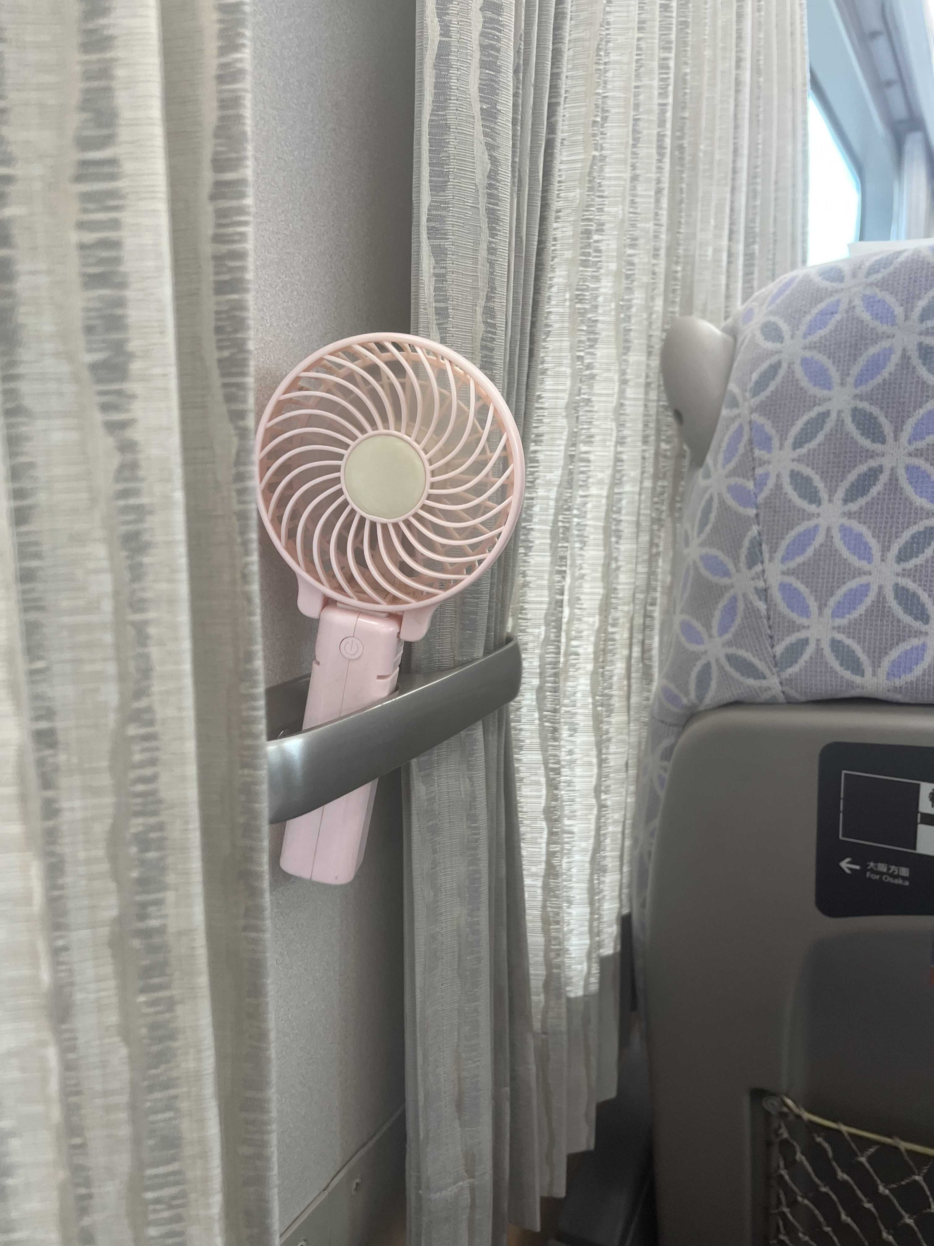 特急の中でも暑かったので扇風機。カーテンを収納するところにシンデレラフィット♪この扇風機、すごく安かったけど優秀。なんだかんだで三年とか四年とか使っている気がします。特急の中だけじゃなくて、自転車で出かけた時の信号待ち、徒歩で出かけたときには日傘と音もしてくれています。意外と充電も長々持つので助かっています~♡