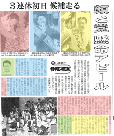 まぁ、(毎回投票に行ってたくらいで)そんなに今まで選挙とか興味なかったんですが、今回ちょっと気合い入れてみようと思いました。でもネットで調べるほど気合い入れる気にもなんないので新聞の登場です。ということで今日の静岡新聞。青=土井氏:民主赤=岩井氏:自民黄=平賀氏:共産緑=矢内氏:幸福実現党なんで矢内さんこんなに隅に追いやられてるのん?土井さんと岩井さんがメインになるのはわかるけど、ちょっとひどいだろ、コレじゃ…。と、あまりにも矢内氏の扱いにびびって思わずパソコンに取り込んじゃったよ。前回の幸福実現党の静岡新聞の扱いはどうだったんでしょう…。そういえば、あまりにも(幸福実現党が)どうでもよくて見てなかった。てか前回はネットで見てたから新聞ちゃんと読んでない。