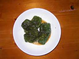 ピーマン揚げ今晩の夕食のおかずで、簡単でとても美味しいピーマン揚げの作り方です。【作り方】1.ピーマンを丸ごと油で揚げる。2.塩少々と味の素をふる。3.醤油をかける。・作り方はこれだけで、とても美味しく食べられますので、一度お試しください。