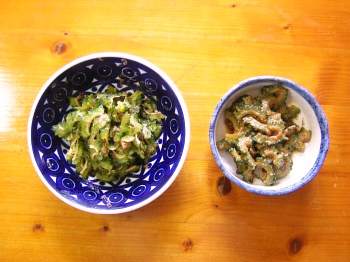 今晩のお勧めは自家製ゴーヤ料理2品です。夏バテ対策にゴーヤの塩揉みと、ゴーヤの味噌炒めです。【塩揉みの作り方】1.ゴーヤをそのまま超薄く切っ て塩揉みしオカカを混ぜる。2.食べる時にお醤油を少しか けて味を調える。・苦さ強烈だけど癖になりそうで す、もちろんビールにピッタリ ですよ。【味噌炒めの作り方】1.薄く切ったゴーヤを軽く炒め る。2.味噌と砂糖を混ぜて作った 垂れを入れさらに炒める。