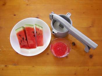 モーニングコーヒーもいいけど、朝のフレッシュジュースも捨てきれません、昨日スイカの切れ端を買って来たのでスイカジュースも作りました、柔らかいので手押し式のジューサーで簡単に出来ます、これが結構美味しくていくらでも飲めてしまう、これにジンを少し入れるとカクテルになりますけど、朝だからね、ジュースにしておきました。