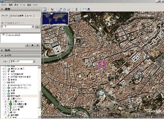 今日も Pearun のお遊びの紹介です、航空写真で世界中旅する事が出来るあの有名な、Google Earth と言うフリーソフトです、時々これで遊んでいますが、ちょつと思い立った様に映画”ローマの休日”に出てくるイタリアローマのトレビの泉(中央の赤○)や真実の顔が有る寺院などを見て歩きました、ナスカの地上絵も見たいと思ったがどうしても位置が解らないので諦めました、自分の家を探す何てのも自家用車まで見えたりして楽しいですね。