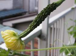 この所の雨でゴーヤも一気に成長しました、長さがボールペンよりちょっと長いくらいまでになったので、後少しで収穫出来そうです。ゴーヤは結構作りやすい作物の様ですね、ツル物なので雑草に近い逞しさが有る様で、気を付けて見て歩くと近くの家でも、塀の金網や畑の周りの金網でゴーヤを育てている家が有りました。うっかり画像を斜めに貼ってしまい、お見苦しい点はごめんなさいです。