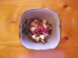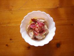 今晩は酒の摘みで、ソーセージのマヨネーズ和えです。【材料】・ソーセージ1本 ・レモンのスライス2~3枚・梅干2個 ・マヨネーズ【作り方】1.ソーセージを乱切りにする。2.レモンスライスを皮ごとみじん切りにして入れ マヨネーズをかけて混ぜる。3.器に盛って梅干しをつぶして果肉を上に乗せて 出来上がりです。