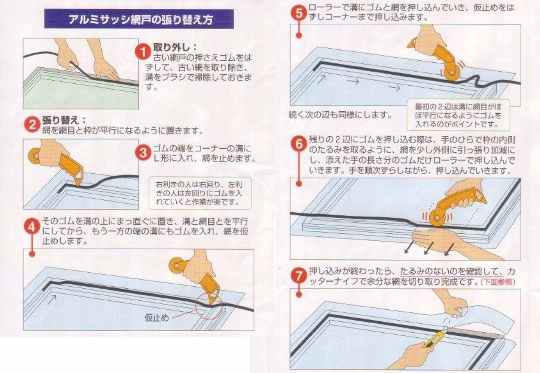 網戸の張替えって意外と簡単なんですよ、ホームセンターなどで女性の方が実際の取り替えデモをやっている事も有りますし、こんな手順を書いた説明もついてますので、誰にでも出来ますよ。5の時に網が斜めにならない様に気をつければ、綺麗にできます。今回は初めてだったので余計な物までゲットしたけど、必要なのは網と止めるゴムとローラーが付いた工具で631円でした、カッターは何処の家庭にも有ると思います。