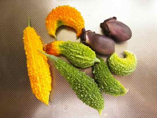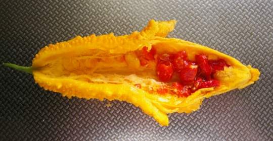 先日収穫した熟して黄色になったゴーヤーが、鑑賞期間も終了時期で黄色の皮がボロボロになってきたので割って見たら、中を見てビックリ真っ赤なゼリー状の物に包まれた種が出て来た、周りのブツブツにふさわしい悪魔を感じさせる、もう1つの顔を見た感じがしました。尚、赤いゼリー状の物は少し甘味がある味でした。