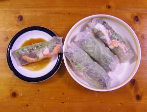 今晩のお勧め料理はライス巻きです、見た目も涼しげでサラダ感覚の野菜がポン酢とチリソースにマッチしてとても美味しく頂けます。【材料】・ライスペーパー ・むき海老と鶏肉ささみ ・ワケギ ・人参 ・サニーレタス ・カイワレダイコン ・ミックスナッツ ・スイート・チリソース ・ポン酢【作り方】1.湯がいて、むき海老は3枚に薄くする 鶏肉ささみは細長く裂く。2.わけぎはライス巻きの長さ程度にカッ トする。3.人参は湯がいて千切りにする。4.ミックスナッツはラップで包んで、上からたたいて細かにする。5.下ごしらえした材料とカイワレダイコンを適量づつ、ライスペーパーを湯冷しにしたして柔らか にして巻く。・スイート・チリソースとポン酢を混ぜ、付けて食べます。