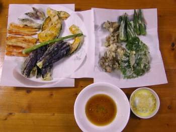 今晩のメインデッシュは天婦羅です、衣をつけて揚げるだけなんで簡単ですけど、サクっとあげるのに衣の粉は冷やして置く事と、あまりかき混ぜると粘りが出るので粉がまだ残っている程度にサラとかき混ぜて、後は具に付けるだけですけど、なるべく薄く付けると美味しくなります。更に揚げたてを食べる事です、汁はこれも麺汁をお湯で割っておろし生姜をちょつと入れて食べると最高です。