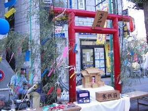写真を整理していたら、先日の七夕祭りの写真にこんな出店の写真が有った、鳥居とお宮が有り、どうやら「おみくじ」の店の様なんですけど、そう言えば暫く見ていたけど客は無いし良く解らない店でした。昔お宮の中から、おみくじをくわえて鳥が出て来た、半分見世物の様のを見た様なきがするけど、これがそうなのかちょっと解らない、出店でした。