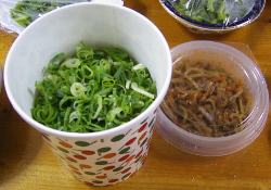 今晩の夕食はネギ丼とか言う、えたいの知れない物を食べました、いや食べさせられたと言った方がふさわしいかも知れない、カップの蓋のしたはキンピラと挽肉の様物が入った浅い入れ物があり、その下はネギで覆い尽くされていた、食べる時にキンピラもどきを入れてかき混ぜて食べるのだが、ネギのしたには味付けご飯が入っていて、味は鶏肉ご飯にネギとキンピラをまぶしたと言った見た目そのままの味だった、あまり美味しい物でなかったのは言うまでも無い。