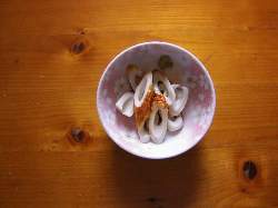 今晩も酒のお摘みで、茗荷の梅肉和えです。茗荷は癖があり好き嫌いが有るので注意して下さい。【材料と作り方】1.茗荷食べるだけ適量を良く洗って最後にお酢を 入れた水に浸して雑菌を駆除する。2.洗った茗荷を乱切りにしてちょっと塩をふってか き混ぜる。3.梅干しをつぶして果肉にして混ぜて出来上が り。