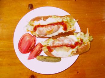 今日の昼食は自家製ホットドックです、パンにキャベツと人参などを炒めた物をはさんで上にウィンナーと、とろけるチーズを乗せてオーブンで焼いて作りました、食べる時にケチャプで味付けします。アクセントはピクルスとトマトを付け合せにして、飲み物は定番のコーヒーで食べました、軽い感じでお腹にも優しく手頃な食事でした。