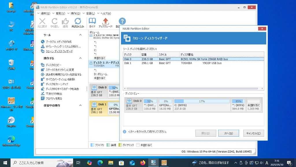 彩の国の今日は朝の内曇り、その後雨の予報です、部屋は少し明るい状態です。 ソースディスクは元々付いていたディスク0を選択 宛先ディスクにUSB接続したディスク1を選択 ここはターゲット上のすべてのパーティーションを削除に変更 左上の適用をクリックして実行します クローンが出来上がりました ドライブ0がドライブ1にクローンされました 出来上がったクローンHDDマウスの右クリックをし、新しいタブで画像を開くと、大きく見れます。新しくゲットした、DELL Optiplex 3070 Win10Pro / Corei5-9500 / SSD256GB / 8GB DVDスーパーマルチドライブ付きを、Windowsa11に更新する事前準備で、買った時に付いていたM.2SSDのクローンを 2.5インチHDDに作りました。作成の為の接続は、SATA/USB変換ケーブルを使って、パソコン本体のUSB端子に HDDを接続して作成しました、作製時間は30分前後くらいで、問題なく出来ました。作成に使った HDDの容量は 320Gと小さかったので、ターゲット上のすべてのパーティーションを削除を選択して作りました。これでトラブルが有っても元の状態に戻せるので、初期不良保証期間中でも気にしないでいじれますので、近い内に Windows11に更新をしようと思います。注意点としては、こういう長時間の作業の時は、あらかじめ設定 / システム / 電源とスリーブで、画面とスリープを共になしに設定しておいて下さい。本日届いた迷惑メール、絶対にアクセスやクリックは、しない様にしましょう。 迷惑メールの内容【今日の一言】マスゴミが報道しないニュース。29万人が避難!中国の都市全体が沈んでいる!武漢での洪水https://www.youtube.com/watch?v=D0g9QTh76SoEV頼みの中国返り討ちに…メーカー倒産続出で経済崩壊!EV完全終了!【海外の反応】https://www.youtube.com/watch?v=es8MyAIsRl0