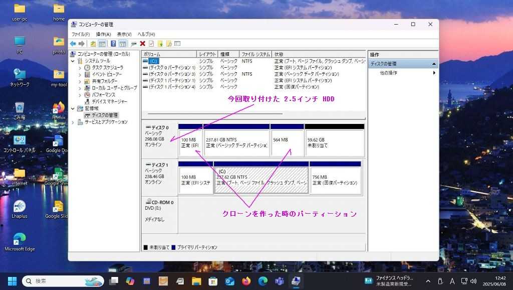 彩の国の今日は午前中雨、午後から晴れの予報です、部屋は暗い状態です。 2.5インチHDDを取り付けた時の状態 NIUBI Partition Editor Free Editionで初期化 出来上がったドライブ構成と容量マウスの右クリックをし、新しいタブで画像を開くと、大きく見れます。新しくゲットした PCにクローンを作った時の 2.5インチHDDを取り付けたので、Windows11のディスク管理では、解放出来ないパーティーションが有り、コマンドで解放するか、パーティーションを扱うソフトなどで解放する必要が有ります。今回はクローン作製で使った、NIUBI Partition Editor Free Editionを使って windows11の予約パーティーションを開放し、新たに2つのパーテーションを作ってフォーマットしました。ドライブレターも DVDが E:になっていたので F:に変更し、新しく取り付けた HDDを D:と E:にしました。参考にさせて頂いたサイトです。NIUBIパーティションエディター無料版 https://www.hdd-tool.com/partition-manager/partition-editor-free.htmlWindows11 SSD HDDの消せないパーティションを完全削除・統合する方法 diskpart解説 $0073https://www.youtube.com/watch?v=ajkbhXVT8TA【今日の一言】マスゴミが報道しないニュース。【海外の反応】日本のスーパーコンピューターが世界1位!異次元の技術力に世界が驚愕【日本の技術】https://www.youtube.com/watch?v=-A_ryJOzCXw【世界騒然】YKKが作った“化け物”発電ガラスついに公開!https://www.youtube.com/watch?v=4zL_fzHdoY0
