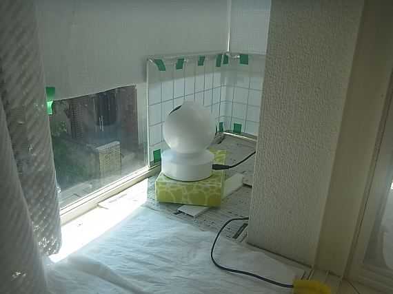 100均のワイヤーネットを曲げてキッチン用アルミシートシートを張りましただけの物ですけど、これを午前中の東からの日が当たっている間は、カメラに日が当たらない様に、出窓のコーナーに置いておく事にしました。