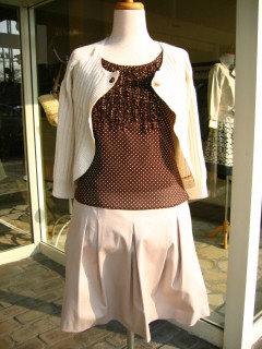 ・・・今日は入荷商品を紹介しますね。・・・ もう着られそうです。なんて可愛いアンサンブルでしょ。 ハリス ドットアンサンブル \15,750 (レーヨン60%・綿40%) 無地のカーディガンにドットのノースリーブ いろいろ着まわせてこのお値段はいいんじゃないですか。となりに写っているのは ハリス ドットリボンノースリーブ\10,500 (レーヨン60%・綿40%) これもまたリボンのボリュームがかわいいJEANNEKE ハンドメイドニットジャケット \19,845Harriss ショートパンツ \15,750ウェブショップ Pebble 通販のご案内はこちらへメンバーズポイントでキャッシュバック! ご登録時に200ポイント お友達紹介、ご購入で500ポイントGETの特典も・・ ご登録は Pebble トップページから