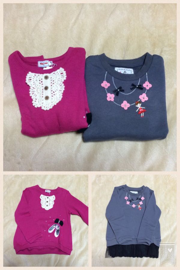 ウィンターフェアで沢山購入したのでSALEはスルーしようかまよったんですがいってしまいました。3日目に行ったんですがお洋服在庫は沢山ありました。靴下やスパッツは品薄になっててあまり選べなかったです。春物も少し購入しました。トレーナーは春物にしては厚手なので今からでも着れそうです。★KP(ニットプランナー)□ティータイムmimi 裏起毛トレーナー(80cm/90cm/95c…価格:6,372円(税込、送料別)*★KP(ニットプランナー)□ニットデニムスカッツ(80cm/90cm/95cm)【子ども服 …価格:6,156円(税込、送料別)★KP(ニットプランナー)▼スカラップ切替花柄 AラインTシャツ(80cm/90cm/95cm…価格:5,292円(税込、送料別)★KP(ニットプランナー)▼コスメmimiチュールトレーナー(80cm/90cm/95cm)【…価格:6,372円(税込、送料別)