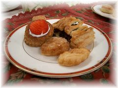 いよいよ、基本中の基本!!いちごのショートケーキの巻です。私は甘いもの大好きなので、ごひいきのケーキ屋さんはあるのですが、新しいショップに行って、まず何を食べて私の口に合うかどうか判断するか??ズバリ、いちごのショートです。スポンジも生クリームも、一番ごまかしが効かないから・・・と思うからです。ベタといえばそれまでですが、これが口に合うとどれ食べても失敗なし!と思ってます。今回から参加された生徒さんで、ケーキ屋さんで働いてたって人がいまして。そこでは、純生クリームとホイップクリーム半々で作ってましたって衝撃のお言葉が!!!いわゆる、動物性のものと植物性のものを経費と扱いの関係から混ぜていたとのこと!!!えぇ???100%純生じゃかなったの??アレ?スポンジが荒い??とかイロイロとクレームはあったけど、スポンジは技術の差かぁと思ったり。でも生クリームって技ないよね??なのに、ナゼに油っぽいんだ?・・、って常に不思議ではあったのです。あぁぁぁ。。でもでも、謎は解けたぁぁぁ 先生、ありがとうございまする、そんな基本的なことワタクシ知りませんでした。そんなことで、「うちの教室では100%純生」と聞き、ワクワクしながら作り始めたのでございます。う・うまいぃぃ!!!!ホントに初心者達が作ったものか???というぐらい、美味しかったれす。それに、ホワイトチョコレートが苦手な私・・・。中央のぐるぐるはホワイトチョコなので、少々げんなりしてたのですが、こ・これはあって正解!!今まで食べてたホワイトチョコは偽者だったに違いない、いや、そうだ!!素材がよければ、多少腕がなくてもおいしいもんです。次は、シュークリームです。私の苦手な絞り袋を使うので、画像をアップできるのかな?・・・不安だ。。。。