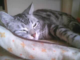 今日は暑いぐらい気温が高い東京ですペグも毎日のんびりお昼寝~先日のことお昼寝から起きてきたペグ寝起きの悪い顔はいつものことだけど、何だか顔のバランスが変だなぁ・・・よ~く見てみたら・・・ぼぉぉぉぉ~おひげに寝グセがついてますいったいどんな形で寝ていたの??おひげに寝グセがつくなんて・・・笑えたわぁ~