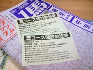 なかなかアップするヒマがなく、6/15の話ですが載せてみます。6/15(日)で春競馬の東京開催が終りました。夏競馬は福島・新潟・小倉・北海道だし、東京の秋開催は10月からなのでしばらく生お馬達に会う機会も減りますねぇ・・・最終日の東京競馬場のイベントに馬場の芝コース解放♪がありました。昨年もあった企画ですが、雨のため中止となり残念しかし今年は天気も良く、初の芝コースを歩いてきました 土日で配られた整理券は2000枚。この整理券がないと入れてくれないのだ お馬のゲート ゲートイン 右見て・・・ 左見て~ スタートしました なんてね~ 4コーナーを回って直線に入ったあたり ゆる~い上り坂が続きます メモリアルスタンドの横を過ぎ~ 間もなくゴール(写真に写っているのはダートコースのゴールですが・・・) 綺麗に見える芝ですが、ゴール間近になると芝の痛みが目立ちます。こんな窪みにお馬がはまったら・・・馬場に入ると草の香りが懐かしい 子供の頃を思い出すような感じ。子供達は馬場を走ったり、コロコロと芝の上を転げ回って洋服が緑色になってるし・・・お母さん、お洗濯が大変ねなんて思ってたら・・・大人もけっこう走り回っている人多し1周回れるのかな?なんて期待したけど、最後の直線コースだけの開放でした。それでも2往復もすると結構な距離。良い運動になりました大人も子供も楽しく過ごせた芝コース開放でした。来年もまたこの企画があるといいな~