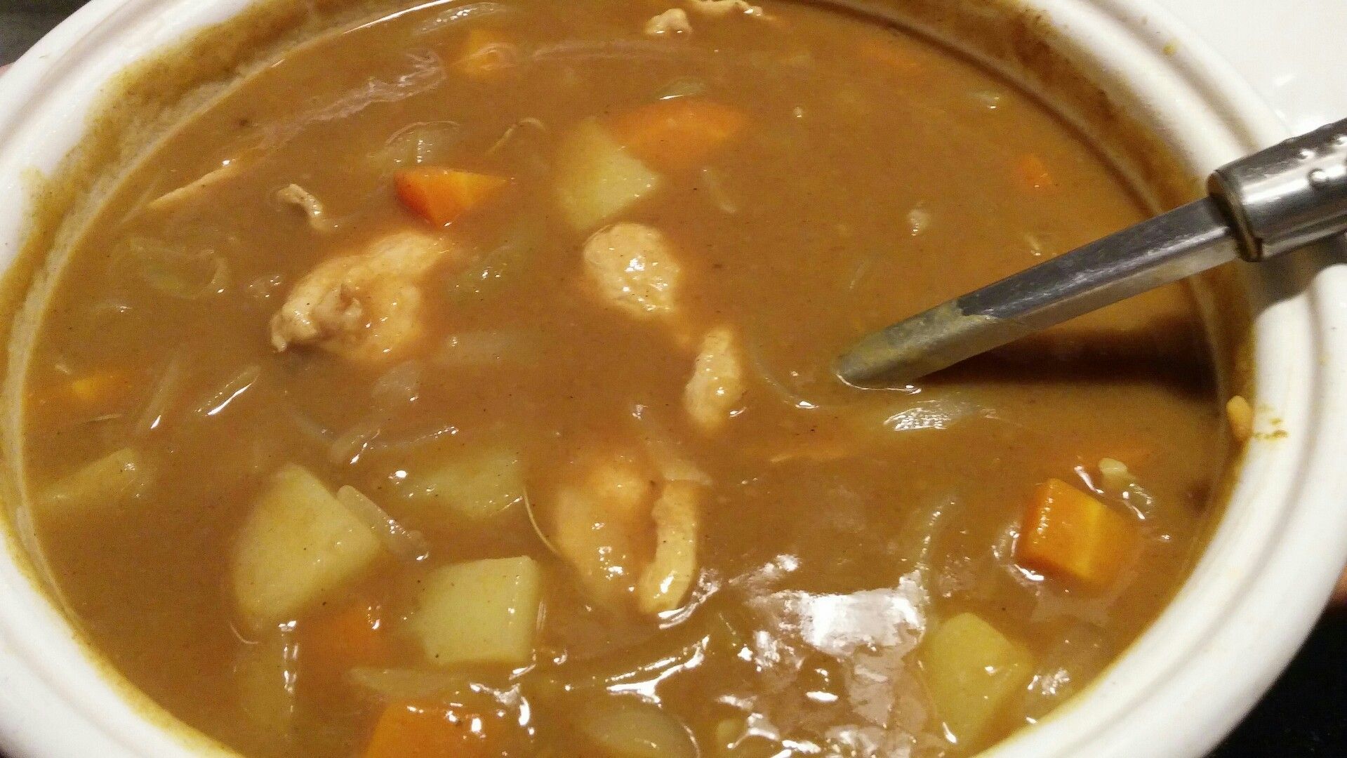 ニンニクとコンソメを入れて、お鍋でグツグツ。柔らかくなったらカレールー投入。