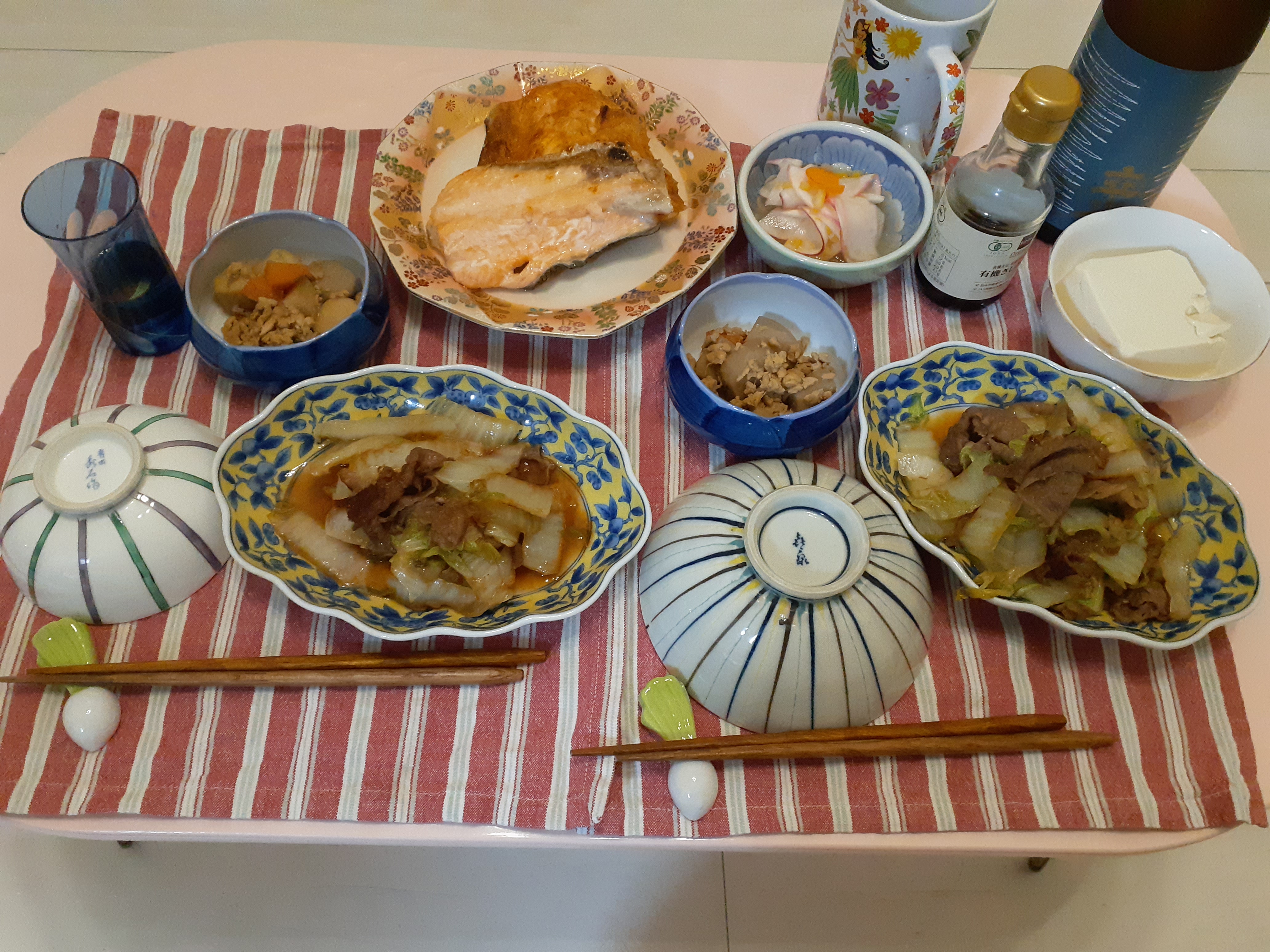 牛肉と白菜炒め、里芋煮っ転がし、蕪柚子甘酢漬け、冷やっこ、鮭塩焼き、ご飯。