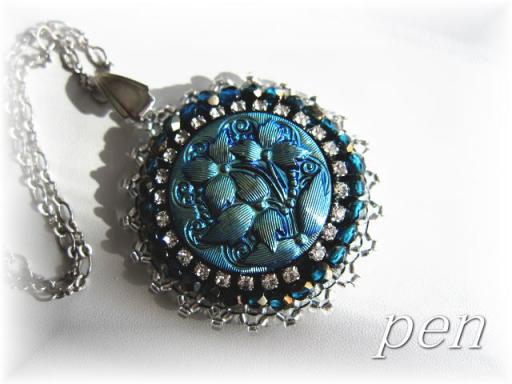 ボタンって普通にボタンでしょ?と、以前は思っていたのですが、このショップのボタンを見て、考えが変わりました~。たくさんのボタンがあり、10個以上購入したのですが、一番気に入ったボタンはこれです。ボタン クラフト用品【ガラスボタン】東欧チェコの伝統ガラス細工花柄「オーロラブラック」釦...価格:250円(税込、送料別)まずは色が美しい。「オーロラブラック」との表示ですが、スタイリッシュなブルーです。ビーダーの私は、これをペンダントにしました。以前のブログ記事ににも載せてますが、こんな感じです。すぐに知り合いに貰われて行きました。(^-^;このブルーってとても個性的でどう使おうか悩んだのですが、シルバーの金具と物凄く合います。このボタンは、髪ゴムなどに単独でつけても、OKだと思います。ボタン クラフト用品【ガラスボタン】東欧チェコの伝統ガラス細工花柄「オーロラブラック」釦...