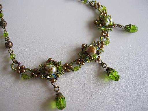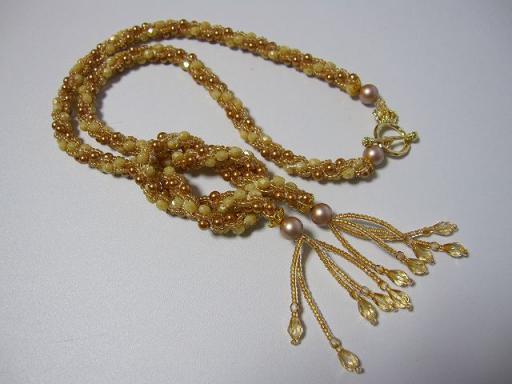今日もクロッシェ♪クロッシェ本(ビーズで作る初めてのジュエリークロッシェ)に載っていて、ずっと憧れていたもの。ステキ・・とクロッシェしているときは思ってました。もちろん手持ちビーズなので、適当なアレンジは加わっているのですが・・・。クロッシェ部分はいいんです(シツコイ・・)でも、フリンジ部分が・・・自分では、あっさりというかスマートに仕上げるつもりでいたのですが、物足りない・・。やっぱりフリンジ部分は「ワンサカ」くらいがちょうどいいんだろうな・・。と作り上げて落ち込み(笑)ほとんどの材料を★アクセサリー通り★さんで購入してます★プラスチックパールビーズシャンパン★★FPオパーキュベージュ★★広島シードビーズライトブロンズライン★★マンテル王冠★★チェコ多面カットドロップロザリン★