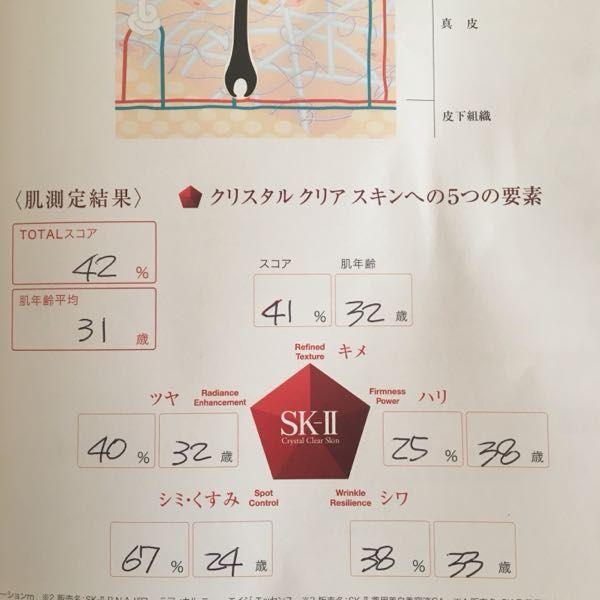 先日SK-IIの店頭に行ったときのことです。 ALBION愛用者の私は、いつもはお肌の水分量と油分だけを測っておりました。 以前どこかのサイトで見かけたときから、 いつかSK-IIで肌診断をしたいと思っていました。 そしてようやく、先日実現したので(勝手に)ご報告したいと思います。←誰に? 実年齢が29歳の私。 結果がこちら えっ??? 微妙!!!←心の声 たったの−5歳!? もっと若いと思ってた!!!←心の声 キメが年相応となり、平均年齢を引き上げてしまいました。 うん、たしかにキメはない。 いやーあの機械、すごいですね。 隠れたシミ予備軍まで見事に映し出してくれました。 恐ろしいほどでてました、シミ予備軍。 そして見たくない毛穴。 今回の結果に言い訳をさせてもらうと、 夏に炎天下の中4時間も素潜りしたのがいけなかったんだな。←ほんとにただの言い訳 そのときに日焼け後のケアはきちんとしたんですが、間に合わなかったようで……やってしまいましたね。 あのときの日焼けさえなけりゃ、もうちょっと若い年齢までいけてたと思うんです。←見苦しい 日焼け止めを塗るようになったのが、ここ1〜2年くらいなので遅かったですね。 美容が好きと言っておきながら、基本的なことをしてない🙅✖️ 私としてはトホホな結果となりましたが、 とにかくこの状態から悪化させないようにしないといけないですね。 顔の日焼けはなくなったので、美白ケアを継続しないと◎ ちなみに現在の状態がこちら 毎日のケアを続けていくしかないですね。 もうじき30代突入なので、さらに気を引き締めてケアを頑張りたいとおもいます👍←だから誰に