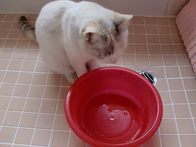 お風呂の洗面器をのぞくはなちゃん ペロペロと結構おいしそうに飲んでました