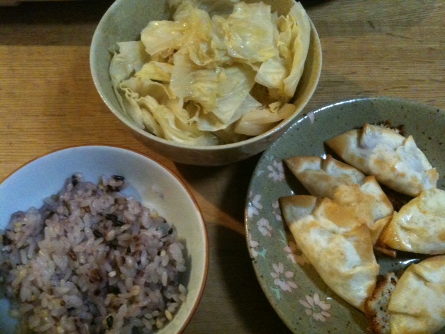 今日も手抜きご飯の紹介です。ご飯は雑穀米を入れて炊いたご飯です。おかずは、なんちゃってロールキャベツ風巻いてないキャベツ煮、と余った餃子の皮で作ったチーズ餃子のオーブン焼き、です。とろけるチーズしかなかったので、とろけるチーズで作ったのですが、やっぱり、チーズが思いっきり流れ出てしまいましたが、オーブンで焼くとぱりっとして美味しいです。こんな手抜き料理を作ってます。
