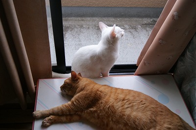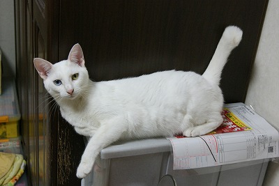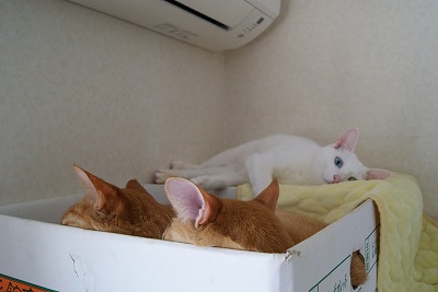 今日は快晴で気温は約33℃まで上がったものの、空気のべたつきもなく心地よい風が吹いていました。この時期にしては珍しいくらい、快適に過ごせました。ただ暑くなってからというもの、夜寝ているときに暑くて夜中に目が覚めてしまったり、あるいは天気が悪くて夜中に雷があると、雷が大キライなリュウ君がパニックになって私が起こされたり、ということがよくあります。だからロクに働いてもいないのに最近は慢性的に眠いという、ナサケナイ状態なのですが。そしてそんな私とはまーったく対照的に、我が家には“日々是元気パワー全開” というお方がいます。はい、この5月で満1歳になった白ニャンのリリーちゃんです1歳ちょっとで遊びたい盛りのリリーちゃん。 退屈は超ニガテです。(これは暑くなる前のときの写真です)リリーちゃん : 「あー、お兄ちゃんたちはアタチの相手をしてくれないから、退屈だわー。。 ニャニか遊ぶことないかしら。 」リリーちゃん : 「ねえ、えみりーさん。 最近はネズミさんはどこに行ったの?」~~あのー。。みんなアニャタがどこかの棚の下へ運んだと思うのだけど。そんなリリーちゃんはときどき、この箱の中で静かに寝ているお兄ちゃんたちに飛び掛って、取っ組み合いを挑みますそして慢性的に寝不足な私が、床に寝っころがってウトウトと昼寝をしていたある日のことでした棚の上の箱の中で2ニャンが大暴れして、2ニャンが箱ごと、下にいる私の顔の上に落ちてきました私はウトウトしながらも気配で危険を察知し、顔に当たる寸前に身をかわして難を逃れました。でももし、あのまま気がつかずにいたら・・・この出来事以降、私は床に寝っころがるときは、顔に雑誌をかぶせるようにしました。以前、TVの 『世界一受けたい授業』 で紹介されていた 雑誌ヘルメット を思い出したからです。 上記のリンクのように頭をガードするというより、雑誌を顔にかぶせて遮光と顔のガードをするという感じです。今どきのようにアイピローなんて洒落たものがなかった昭和の時代によく見た風景。でもこれ、なかなかナイスですリリーちゃん : 「お兄ちゃんたちって本当にニャカ良しなのね。 アタチ、割り込めないわ」小太郎の身体に手をかける康太郎。 どちらも可愛いですリリーちゃん : 「あーん、もう、、、退屈っ!! にゃんか遊ぶものないかなー。。」小太郎、康太郎 : 「・・・・・・・。(寝てるけど耳だけは起きています)」