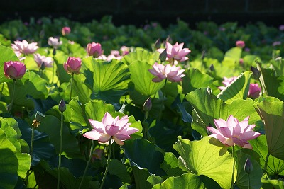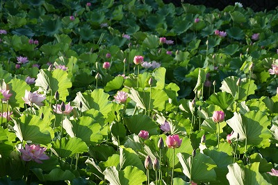 台風が去った今日、台風一過の爽やかな青空ではなかったのですが、暑かったのは昼頃まで。午後からは曇り空で涼しい風が吹き、この時期にしては珍しく心地よく過ごせました。さて先日のことですが、夜中に暑さで目が覚めて、その後は眠れないまま結局夜が明けたことがありました。夏至を過ぎてまだそれほど日がたってないから、夜明けは4時半頃でしょうか。その後も眠れず、空はどんどん明るくなってきます。どうせ眠れないし、空は朝から快晴の青空。ふと、我が家の近場にハスの池があることを思い出しました炎天下の昼間に行動する気力はもうないけど、早朝の今ならいいか。そう思ったので、ちょっと朝っぱらから撮り歩きしてきました。ここは隠れたハスの名所です。6時半頃に現地に着いたときには、私の他に数人、カメラを持って来ていました。UPしたのは、そのときに撮ったものです。早朝でまだ太陽高度が低いので、光が横から差し込んできます。開花したてのハス。 まだ開ききっていないので、ピンクが濃く見えます。こちらは白いハス。 水面の上に咲くので、近くで撮れないのが残念です。池一面のハス。 七分咲きくらいになってて、ちょうど見ごろでした。仕事中のハチ、大と小。全身が花粉まみれです。 しっかり働いたようです。このとき、現地で一緒に写真を撮ってた見ず知らずの年配の男性が、お話のついでに写真の撮りかたを少し教えてくださいました。私が撮るときにその男性は、「光が強すぎるのはよくない」 と、自分の麦わら帽子を花の上にかざし、柔らかい光にしてくれました。見ず知らずの私めに、ノウハウの講習をありがとうございました『一期一会』 であろう出会いと交流に、感謝です。