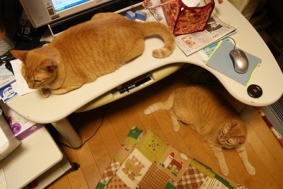 今日は昨日以上に暑い一日となりました。このエリアでは、最高気温が約36℃日中に外出し、買い物や食事などで店舗の中に入ったときは、エアコンの冷気の心地良さで人心地がつきますただ店舗の中には、いったいエアコンの設定温度をどれだけにしているのか?と思うほど、店内が暑い店もあります。先日とあるホームセンターに行ったときのこと。店内のところどころで大型の扇風機がブォ~ンと回っていて、「節電のため、ご協力ください」 と書いた張り紙が。大型扇風機は風力を 「強」 にしてあるもののちっとも涼しくはなく、店内には生暖かい風が流れています。でも、ま、いいでしょう。居心地のいい空間だと時間があれば店内をぶらぶらしてしまい、「あ、いいな」 と思うと、とりたてて必要のない物まで買ってしまうことがあるからね。居心地が良くない場所なら、目的の物をさっさと探して購入して、すぐにでも店から出ていきます。だから余計な買い物はしない。これも悪くないかもしれませんねさて、UPした画像は、我が家の日常の風景です。私の可愛いニャンズたちは、居心地のいい場所を探しては、それぞれ自由にくつろいでいるそんな風景です私が仕事の準備を始めると、それに合わせるかのように兄弟が一緒にやってきて、机の上に来て寝そべり始めます。可愛いけど・・・嬉しいけど・・・実は邪魔です。ふたりとも、何か動くものを見つけたようです。小さな羽虫でもいたのかな?いったい何がいたのか私にはわからなかったのですが、ずっと何かを目で追っていました。私がゴハンを出すのが遅いと、我慢できないときはフードの袋を引っ張り出して、袋をくい破って自主的に食べています。このときの犯ニャンはリリーちゃんではありません。ためしに、いろんな場所で寝てみます。このベッドはフワフワだけど、夏場はちょっと暑いかな。夜、寝るとき。 私の枕元でくつろいでいます。可愛いふたりが一緒で、私がいちばん喜んでいます家の中から出たことがないので、6歳を過ぎた今でも足裏は柔らかくて綺麗なままです。お坊ちゃまだもんねー。 小太郎、康太郎♪
